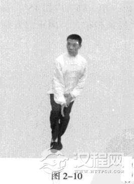 起势熊出洞。以头领身身带步,使重心前移,在重心前移、身体失重的情况下,左脚为了保证重心,不由自主地向前踩出一步,脚尖着地,内扣大约15度,右脚随追半步;同时,右手顺胸腹经左胯、左腿外,向正前方以掌外侧发力,指尖朝下,右肩在前。(图2-2)