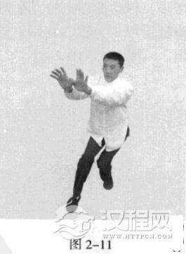 承上式。以头领身,身带步,移动重心向前,右脚过左脚向前踩出一步,脚尖落地,内扣15度,左脚随即追上半步,重心在后;顺势双手拇指相扣,向正前方推出,掌根发力,走直线、三角随心所欲。(图2-9-图2-11)