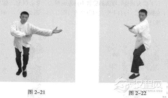 接着,以头领身,身带步,左脚过右脚向前踩出一步,脚尖落地内扣15度,右脚随追半步,成立身中正之势;同时。左手借头领身时腰部的旋转力向前方右侧横击,掌心朝上.右手按于右侧腰际,与左手形成对争之力(图2-21、图2-22)。以上为左势,直线练习即可。