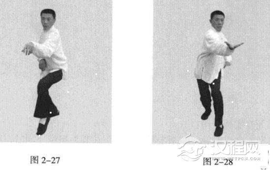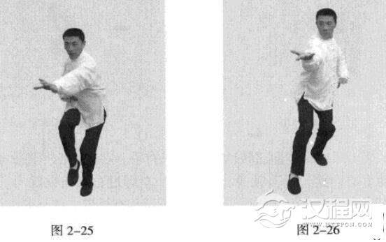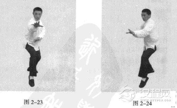 接上式。身体向右转动180度,成右手、右脚在前(图2-23),移动重心向前,以头领身,身带步,左脚过右脚向前踩出一步,脚尖落地内扣15度;同时,左手从上下压并有拇带之劲(图2-24)。