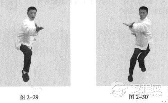 承上式。移动重心向前,以头领身,身带步,右脚过左脚向前踩出一步,内扣巧。,左脚随迫半步,以保持重心稳固;同时,左手借头领身时腰部的旋转力,由后向前方右侧横击.掌心朝上,右手由前方回拉,下按于右侧腰际与发力之左手形成争力,成左肩、右脚在前,右肩、左脚在后的拗势身形;目视前方。如此循环练习即可。走直线、三角、圆形随心所欲。(图2-29、图2-30)