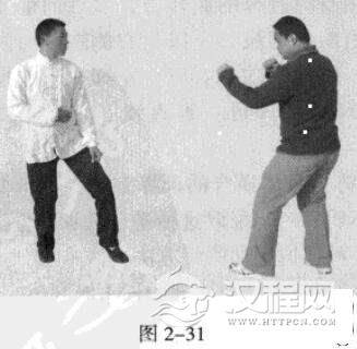 接着,腰部旋转,再以左掌击打敌人头部,同时左脚向前寸步踩进。(图2-33)