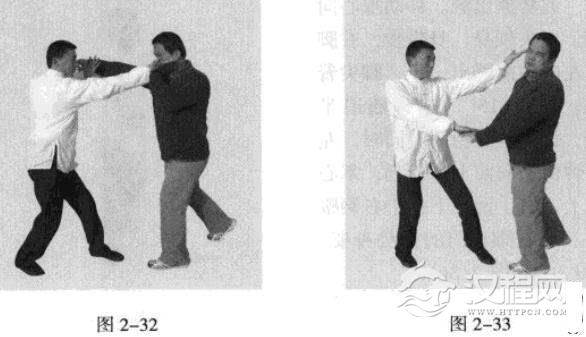 敌左势以右拳或左拳击我。我左手顺其力持带,同时,以右掌猛击敌人头颈部(图2-31、图2-32)。