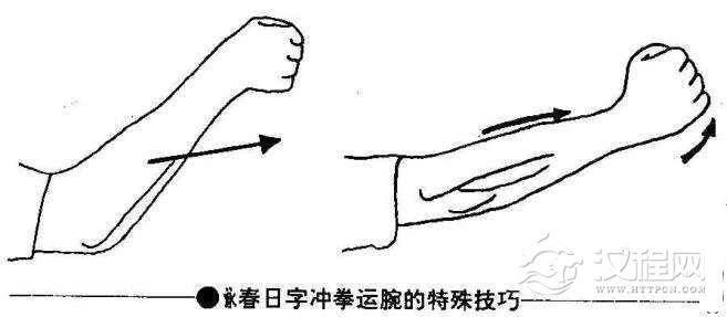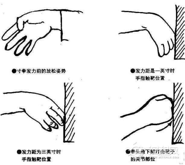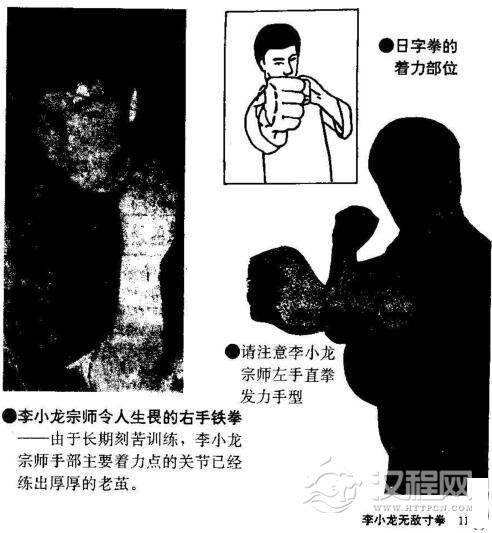 “以增加因螺旋动作所产生的力劲”,其着力点在日字拳的下部三个指节上(如图).在李小龙寸拳发力技术中,此种用腕方式亦得到最好的应用,是寸举发力加速的最后和决定性环节。(如图所示)