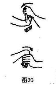 练习法:手抓握另一手,向伸腕方向有节奏压振20-30次,然后再向屈腕方向压振20-30次,连做3组、然后换另一手练,亦做3组,(图30)