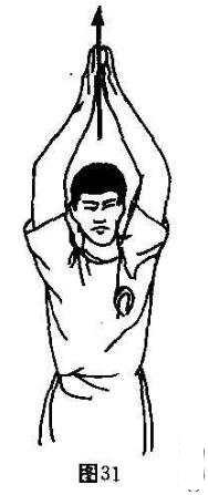 练习法:两手掌背相贴,两臂尽量于头部上方垂直上举伸展运动,反复练习10-20次X2组(图31)。