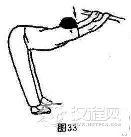 练习方法:两手扶器械或肋木,上体向下反复振胸压肩,将肩关节韧带拉开(图33).反复练习30次X2组.