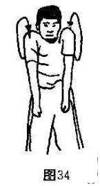 练习方法:双脚开立,·双肩作上下前后耸肩回环动作,反复练习10-20秒X 2组(图34)。