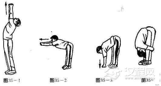 练习方法:双脚并立,双手交握向上(图35-1).向前(图35--2),向下(图35--- 3)尽力伸展并保持5-8秒,然后上体前俯,胸部贴紧大腿,双手抱紧双腿保持5^-8秒(图35-4),如此反复练习三组。练习时注意动作幅度要大。