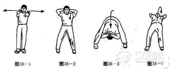 练习方法:两脚井立.两臂前伸然后向两侧扩胸10次(图36-1),不停.两脚分开,双手抱头。向前尽量俯身立起10次(图36-2,3),不停,再向后尽量仰身立起10次(图36-4),