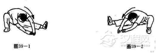 练习方法:一腿屈膝,一腿侧伸直腿(脚跟着地)。然后上体尽量向侧伸腿侧尽力前俯压振15-20秒(图39-1),然后再交换侧下另一腿15-20秒。(图39-2)
