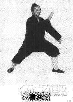 ④搂膝之手臂呈弧形,不要伸直,推出的右掌要先是五指头朝前,有牵引之意,呈水波或弧形推出,到定势,即与左弓步脚尖相对时,微微坐腕,有神达力吐之意。