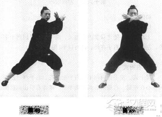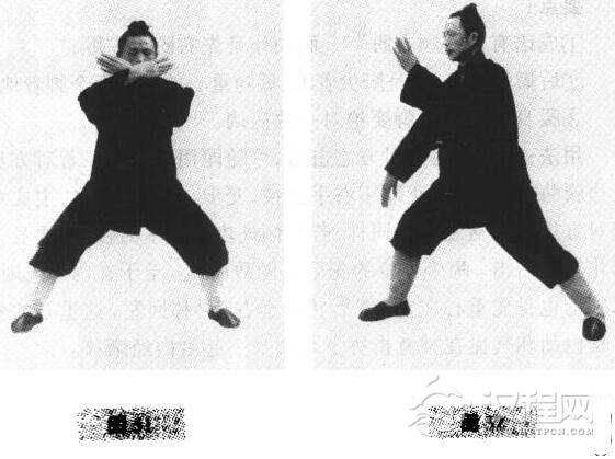 用法:十字架封住对方之击后,可随即用腿击之。若对方从右边腰胁推击过来,我即用右手拂楼,变步,左掌推击之,主要对应对方用力转猛之势。同样,若左侧进攻则左掌回楼.同腰身一起化转后右击。两个方位的先后是随敌而变。至于在内练之时,原则上也是先重心在左,然后转移至右,再移回左,这重心的变化是内劲和气血在神意指挥下与腰身一起沿内经渐移。