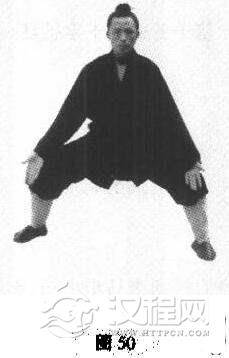 上动不停。腰身右转回至马步中档,十字架手在面前,左右手各自分两前侧划圆弧而下,至膝前,掌心朝外(图49、图50)