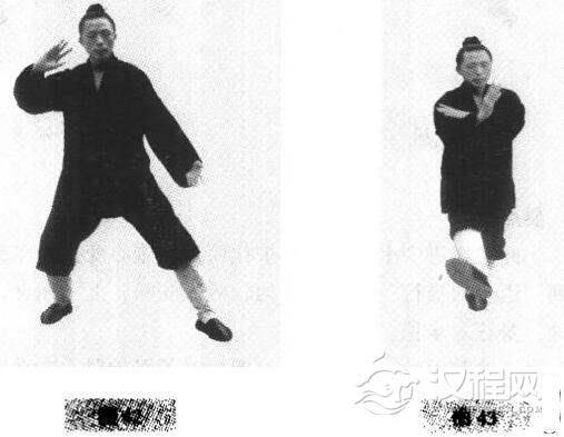 2.上动不停。身体左转,重心随腰渐转至左腿,右腿提起向前经左腿侧划弧出腿,落在离原地两脚距的地方;右手划圆弧与左手又于胸前,右脚跟先着地(图43)。渐至承受重心于右脚,脚落全实,左腿随身体的右转而上步(图44)
