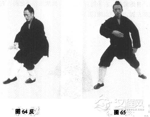 上动不停。身体右转,右脚后撤至左脚尺半处,先由脚尖着地,后全着地承受重心,随身右转之时,右臂随之动,屈肘至腰间(图65)。