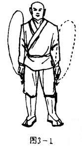 两足八字步站立,上体正直,两臂自然下垂,两掌五指并拢,贴于两腿外侧,掌心向内,掌指向下.目视前方(图3-1).