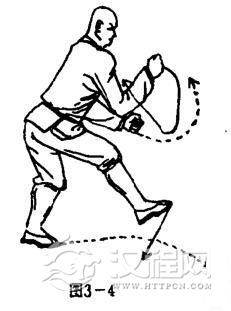 两脚为轴,体左转90度,右腿屈膝提起,左腿独立支撑,同时,上体前倾,两臂屈肘两拳护于体前,右拳高与鼻齐,拳心向左,拳眼向内,左拳高与腰齐,拳心向右,拳眼向上.目视前方(图3-4)