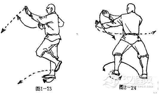 上动不停,左脚向前一步落地为轴,右脚跟内旋,体右转90度,两腿屈膝成马步,同时左掌在左侧向左斜下方切击,掌心向前,掌指向左;右掌向左上搓击,掌心向后,掌指向左,两臂成交叉势.目视左侧(图2一24).