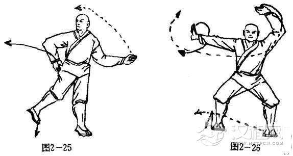 以左脚为轴,体左转180度,右腿屈膝抬起成独立势;同时左掌随转体向左屈肘撩穿,掌心向前,掌指向左,右臂屈肘以右掌收护于右胯外前上侧,掌心向内,掌指斜向下.目视右侧(图2一25).
