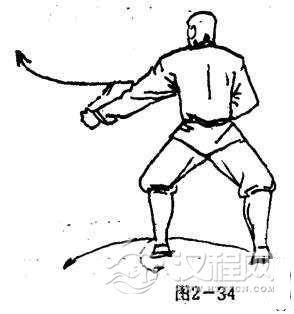 左脚向左一步,震脚落地两腿屈膝成马步,同时,两掌变拳,左拳向左下侧冲击斜撑,拳心向前,拳眼斜向上.右臂屈肘右拳护于腰间右前侧,拳心向上,拳眼向外。目视左侧方(图2一34)