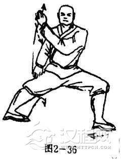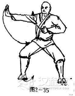 两脚跟为轴两脚尖左旋90度,左腿屈膝,右腿蹬直成左横弓步;同时,左臂屈肘左掌撩穿于右肩前外上侧,掌心向后,掌指斜向上,右掌向下按于右胯外侧,掌心向后,掌指向下.目视前方(图2一36).