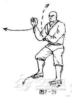 上动不停,右脚落地为轴,体右转90度,左腿屈膝提至右脚内侧,同时双手继续向外旋转缠握,屈肘护于腹前,两掌心向里,掌指向下.目视左前侧方(图2一33).