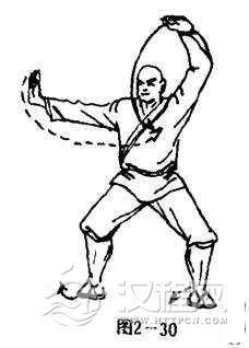左脚抬起,震脚落地,以左脚为轴体左转90度,右腿屈膝提起,成独立势,同时,左掌随势向外旋腕缠绕,然后屈肘收护于右肋前外侧,掌心向下,掌指向前,右掌随势屈肘经头上撩穿于体前,掌心向左,掌指向上.目视前方(图2一29).