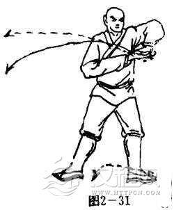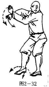 右脚尖外旋,左脚跟内旋,两腿成一字桩步,同时,两臂屈肘两掌在胸前左侧夹击拍挤,左掌左上拍击右掌掌背,两掌心向下,掌指斜向外。目视两掌前方(图2一31).