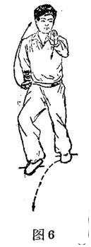 ①右进步挂抹掌:重心左移,体上升。左脚左外碾地15度成挺腿踏实。右脚随左外碾地向右前方进一步成屈膝踏实。与此同时,左手由体右前向右侧后上方、过头顶向前顺时针划弧约300度挂抹掌,与肩同高,手心向前。右拳随左手挂掌、向右腰侧划弧、抱拳,拳心向上。体成右屈膝抱拳抹掌势,目视左手。(图6)