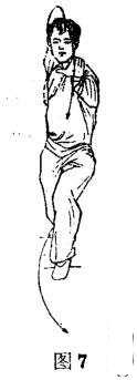 ②左进步右后抡臂:上动不停,重心在右,体上升。右脚右外碾地30度后跟抬起,前掌着地,屈膝。左脚随右外碾地向左前方进一步屈膝踏实。与此同时,右手变掌向右侧后上方顺时针划弧抢臂,高于肩,手心向上。左手随右后伦臂向前划弧压掌,手心向下。体成左屈膝右后抡臂势,目视左手。(图7)
