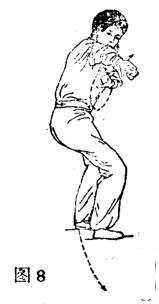 ③进步屈膝抡臂穿掌:.上动不停,重心在左,体下蹲。左脚左外碾地90度成屈膝踏实。右脚随左外碾地向左脚内侧方进一步屈膝踏实。与此同时,右手由右上方向上、过头向前下方顺时针划弧抡臂,低于肩,手尖向前,手心向右侧外。左手随右抡臂向右腋下划弧穿掌。体成双屈膝抡臂穿掌势,目视右手。(图8)