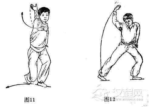 ⑥抡臂转体:上动不停,重心左移,体下蹲。双脚左外碾地90度,左腿屈膝踏实,右脚屈膝后跟抬起,前掌着地。与此同时,双手随左外碾地划弧180度(半圆)抡臂,左手高于肩,右手低于肩。体成左屈膝抡臂势,目视右手。(图11)