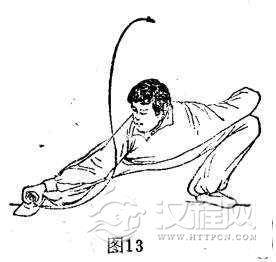 ②右仆步云杯:上动不停,重心在左,体下蹲。右脚右外碾地90度成仆腿踏实。体随右外醒地成全蹲。右手由右肩上方向右侧下方、向右脚背_L-逆时针划弧云杯。体成右仆步右云杯势,目视右手。(图13)