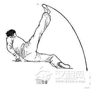 ①左摆旋腿,体成右侧卧,上休向下侧贴地。与此同时,左脚由左侧上方向下、向右脚前、转向头上方顺时针划弧约330度摆旋腿。体成右侧卧摆旋腿势,目视体前方。(图59)