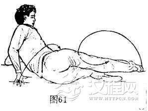 ①左侧卧旋腿:上肢不动。右脚由右侧上方向下顺时针划弧旋腿,着地。体成左侧卧势,目视右脚。(图61)