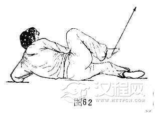 ②左侧卧右缠腿:体成左侧卧。右手由左后方离地向上、过体右腰向前下方、向右腹前顺时针划弧摆掌。右脚由右下方离地向上、向前、向回、向后逆时针划弧约330度缠腿,屈膝。体成左侧卧右缠腿势,目视体左下侧。(图62)