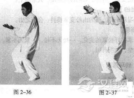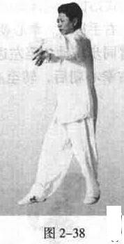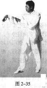 两臂向前平行平伸,手心朝下,先两肩、两手及前臂同时向里、向下合挤,两手心外翻向上,两肘抵腰,沉肩坠肘(图2一36)。