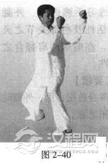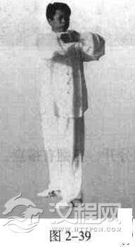 双手互抱肘,上臂平直,然后绕竖轴(脊柱)左右摇动;目视前方(图2一39)。