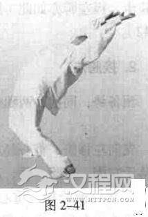 左脚向左迈一步,两脚间距与肩同宽,双手上举,掌心朝前.下身不动,上身前俯,然后向左、向后、向右、向前大循环活腰,然后再反方向大循环活腰(图2一41)。反复运动。