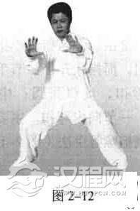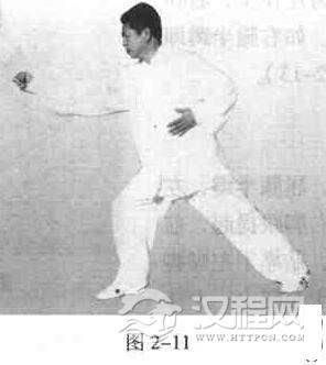 右脚前上一大步,屈膝半蹲,小腿垂直地面,脚尖微内扣。左腿挺膝伸直,下胯,脚尖内扣,两脚全脚掌着地,十趾抓地。重心所放位置为前腿七.后腿三。如左腿膝微屈,其余相同,重心所放位置为前腿六,后腿四(亦称虎步常用)亦可。图2一11为右弓步。左弓步亦相反对称。