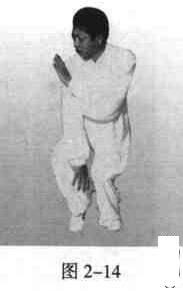 两腿并步,屈膝半蹲,左全脚掌着地;右脚跟提起,前脚趾虚着地面,贴靠干左脚脚弓处,重心落于左腿上;上体正直;两臂自然松垂,头顶项领;目视前方(图2一14)。