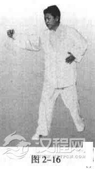 在提膝步基础上,前脚全脚掌着地、踩实,脚尖内扣,重心放于中间,两脚各担五五。此步型为双重步法,只在站桩和发力时用,其余运动过程不允许(图2一16)