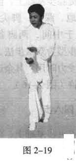 在三七步基础上,前腿后撤,重心后移.后腿九、前腿一,即是(图2一19)。似提膝步。