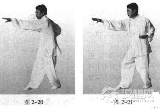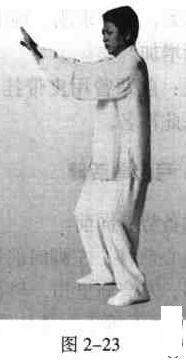 重心移至左腿,屈膝下蹲内扣,右脚前伸成三七步型,脚尖微内扣,脚跟虚落地面;身正腰挺,舒胸下气,尾间中正;合膝裹胯,十趾松抓地面;双手成凹拢掌型,收于腰间并微外翻,松肩坠肘,左臂裹肘挤肋,顺心口处向前平伸至远,高不过肩;手指微扣,手腕松挺。成拗步手(图2一20)。左臂裹肘撤回,同时右臂裹肘挤肋,顺心口处前伸至两手交接时,两手同时滚翻,左手顺右手虎口处撤回肋下,右手顺左掌轮前伸至远,成顺步手。掬顶步和拗步手时,两腿要有撑挟之力,松肩探背,呼吸要自然,气要涵养于丹田处。此为伸肩之一个循环,随之反复连续缓缓操之。换脚亦然(图2一21)。