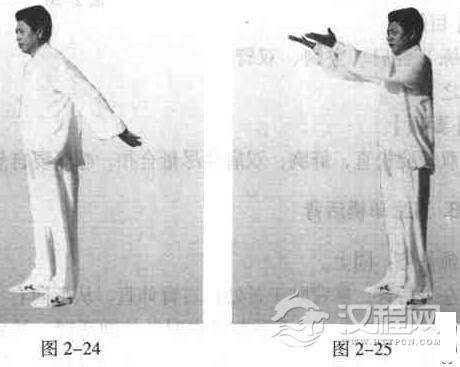 预备势:双脚并拢站立,左脚向左跨出,成马步;双手平行立掌,掌心朝前平推,沉肩坠肘悬腕,指尖高与眉齐;然后,以两掌间距中心点为圆心,直臂由左向上、向右、向下顺时会仁刘圆活臂,两手间距不变,如同面对墙壁揉球,意在膀根(图2一23)