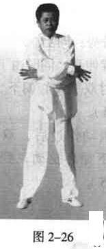 左、右臂分别同时由左、右两侧向上托起(手心朝上),在头顶上方交叉后.继续向右、向左,向下划圆抡动。经胸前时双肩要合扣,向下时掌心向内,循环操之50次为一组(图2一26)。