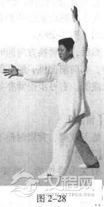 然后,双臂换方向同时抡动,亦向前上挑.经耳侧立抡成圆。右弓步抡臂亦如此。