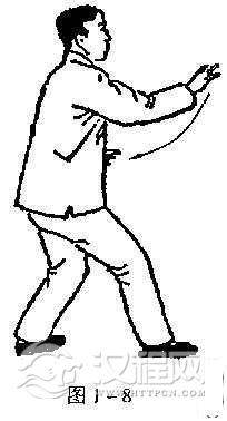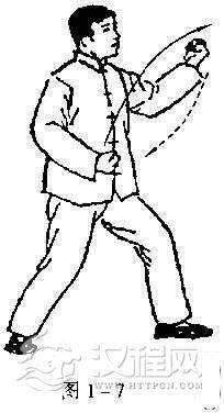 3.上式不停,左拳经胸前由下颌处向前上方钻出(“拳从口出”之谓也),高与口平,拳心斜向外上方,小指朝上,肘尖下垂,肩向前松,肤屈曲约110度一130度;右拳不动,眼看左拳;与左拳钻出的同时,左脚向前垫半步,脚尖外撇约45度,膝微屈,重心移向左腿;右腿向后蹬劲,但膝仍要微屈,不可挺直;同时,吸气一口,吸气尽而式成(图1一7)。