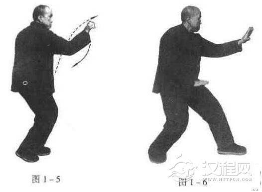 呼气时,左拳上提,小臂外旋,以肘擦左肋发而伸向胸前.拳眼向左,自右拳上向前,拳散开变掌,边内旋翻掌边向下方劈去,高与肩平;同时,右拳亦变掌,掌心朝下,拉回下按于右肋下之日月穴旁;与劈掌之同时,左脚笔直向前踵出一步,前后脚相撇约两脚半之远;手足要同时动作,掌随呼气而下落,呼气尽面式成(图1一6)